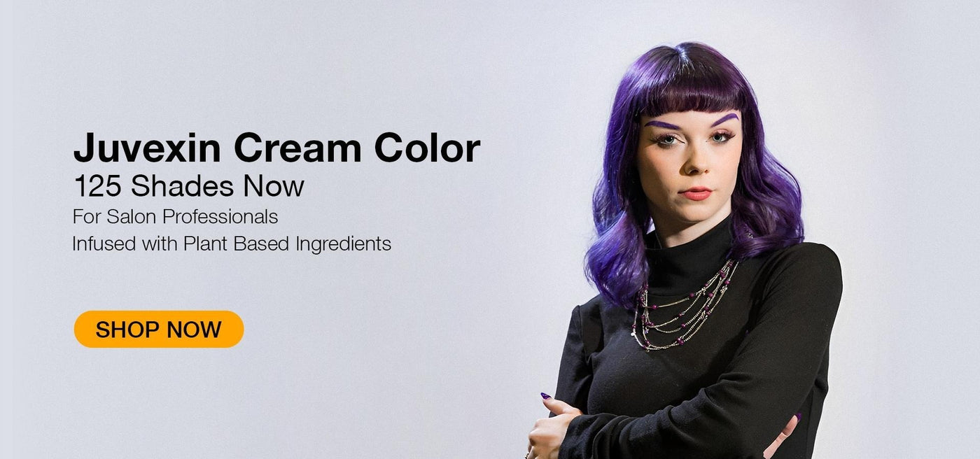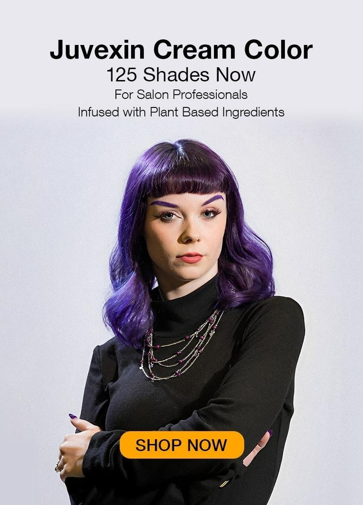 Resalte con finas rodajas de Juvexin Lightening Powder + y 10 Volume Developer. Lavado con champú hidratante. Tonificó su cabello con 10+ 8 Volume Developer durante 5 minutos.